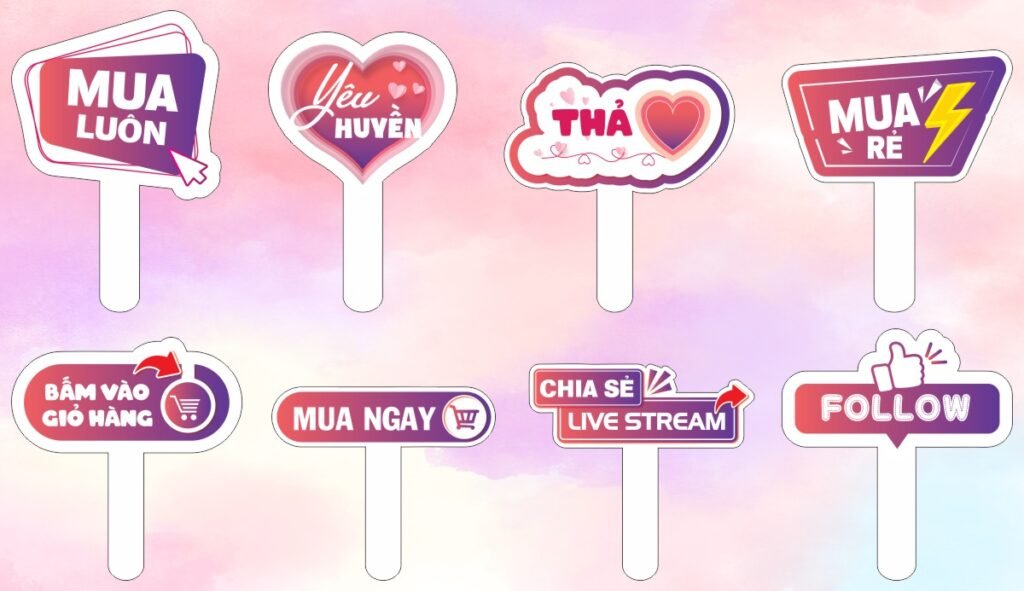 Hashtag cầm tay livestream là một loại phụ kiện hỗ trợ livestream bán hàng, thường được thiết kế dưới dạng bảng nhỏ hoặc tấm nhựa có tay cầm. Trên bảng sẽ in các hashtag liên quan đến bán hàng, khuyến mãi hoặc xu hướng mạng xã hội.